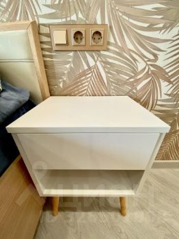 В квартире остается почти вся бытовая техника (техника практически новая), также остается вся мебель. В зале двуспальная кровать с хорошим матрасом, у каждой стороны кровати тумбочка, розетки и выключатель света.